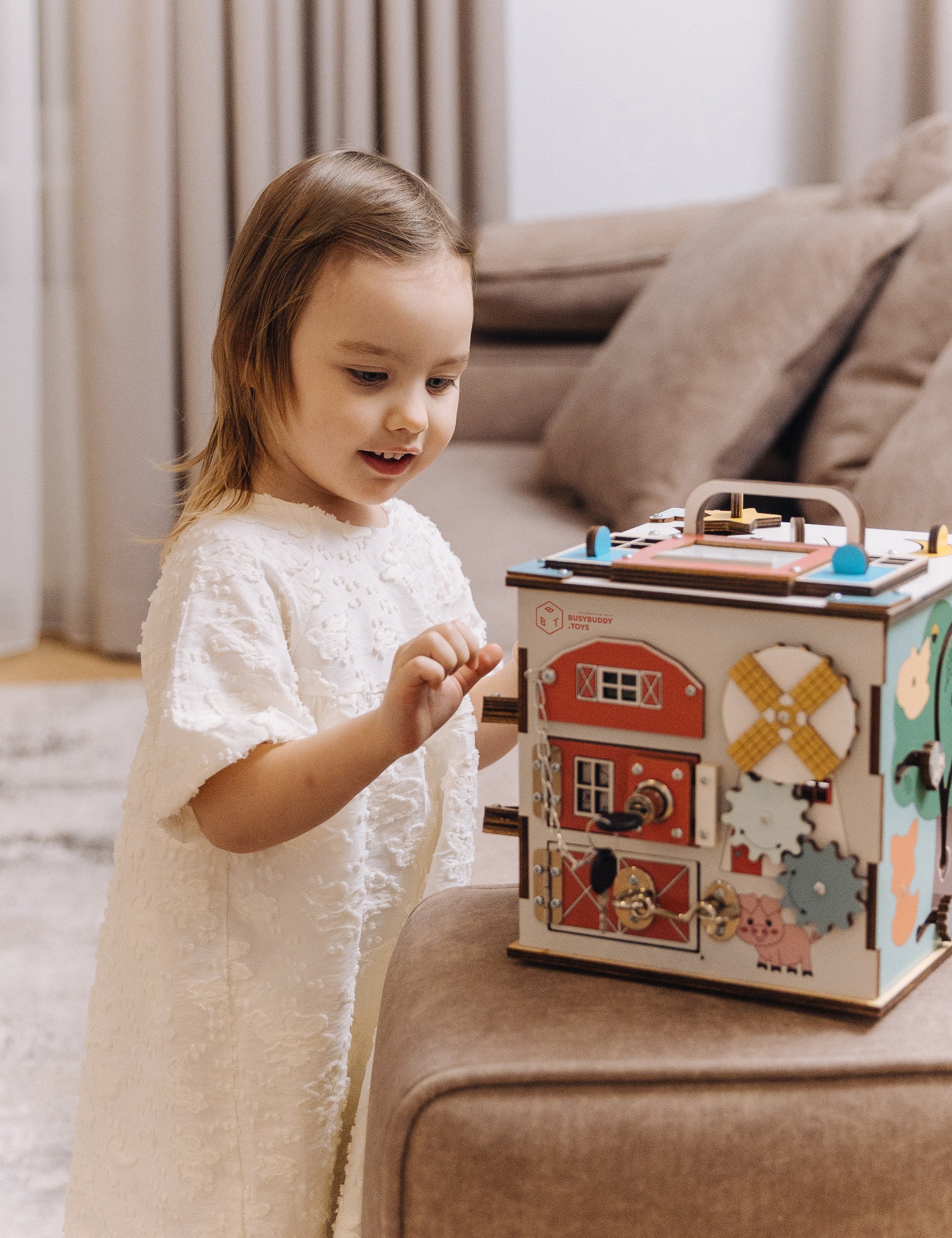 A wooden busy cube is more than just a toy — it’s a little treasure chest of joy and discovery for your child. Made with care and designed to spark curiosity, it offers endless activities that engage little hands and growing minds. Each side is thoughtfully crafted to encourage fine motor skills, problem-solving, and imagination, all while blending beautifully into your home.